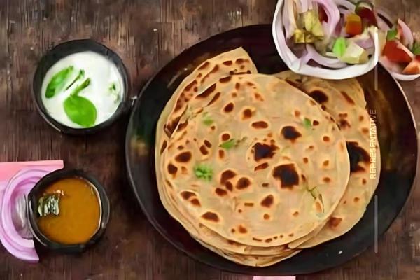 Flaky, buttery paratha layered with richness and flavor. Golden-brown perfection, crisp on the outside, soft within.