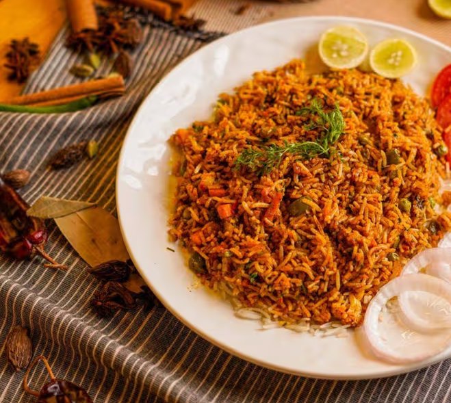 A flavorful and aromatic rice dish cooked with colorful veggies with a desi twist, perfect for any time of day.